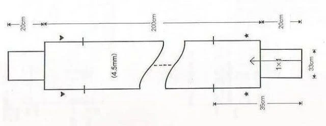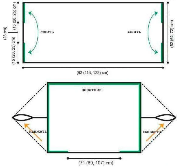 Выкройка, по которой вяжется, очень проста. Начинаем от одного рукава и заканчиваем другим. Рукава можно начать и окончить резинкой. А основное полотно может быть каким-либо узором или просто лицевой гладью.