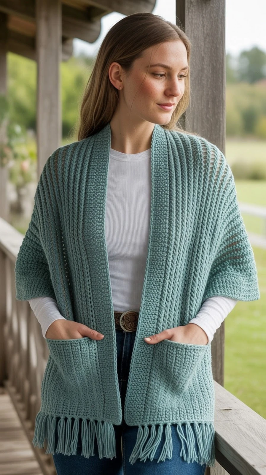 Это длинное прямоугольное полотно с отверстиями или встроенными рукавами по краям. Его можно носить как:
