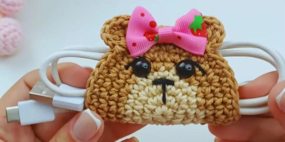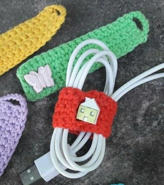 Небольшой вязаный держатель с пуговицей или кнопкой помогает хранить наушники и зарядки в порядке. Времени займет около 20–30 минут и практический подарок к 14 февраля, который точно будут использовать, готов.