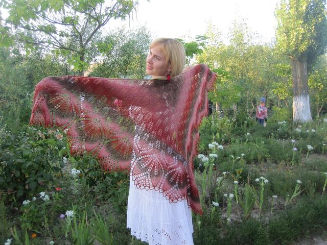Ось таку чудову ажурну шаль зв'язала і поділилася з нами фото звітом наша чудова майстриня Любов Дарчук. Це виріб з секційної пряжі Кауни від Естонської фабрики Adde Long. Це 100% вовняна пряжа в якій використовуються просто дивовижні переходи кольору. Також ця пряжа використовується для в'язання жаккардом. Вона досить тонка, але тепла. Трохи колится, але після прання стає м'якше.