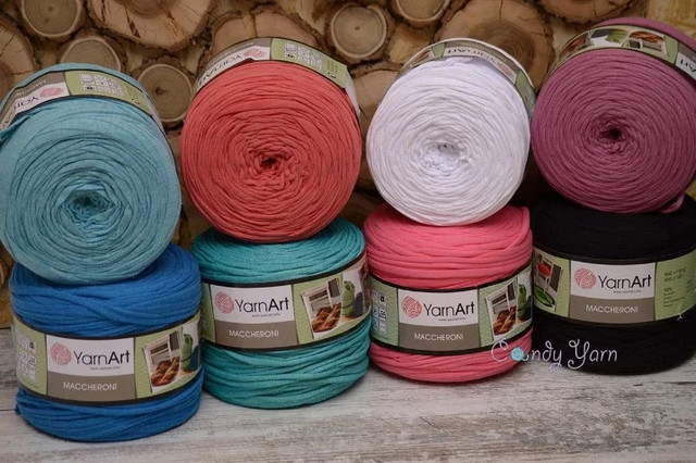 Пряжа трикотажна "вторичка", яка тим не менш дуже популярна для в'язання килимків і кошиків, а також сумок і рюкзаків. Вигідним перевагою ЯрнАрт Мачерони (Макарони) є звичайно ж ціна в перерахунку на метр пряжа, але при роботі потрібно враховувати не однорідність нитки обумовлену методом виготовлення стрічкової пряжі вторинного виробництва.