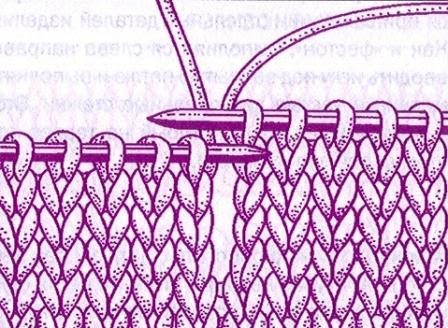 Повертаємо роботу, першу петлю знімаємо не провязанной, робочу нитку відводимо за ліву спицю. В'яжемо планку і петлі основного полотна. Останню петлю в'яжемо разом з другим накидом за задню стінку. Перевертаємо в'язання. Першу петлю знімаємо. Петлі пров'язуємо планки і основного полотна. Наступний виворітний ряд в'яжемо петлі основного вироби, петлі планки, останню петлю пров'язуємо з третім накидом і в'яжемо всі петлі планки.