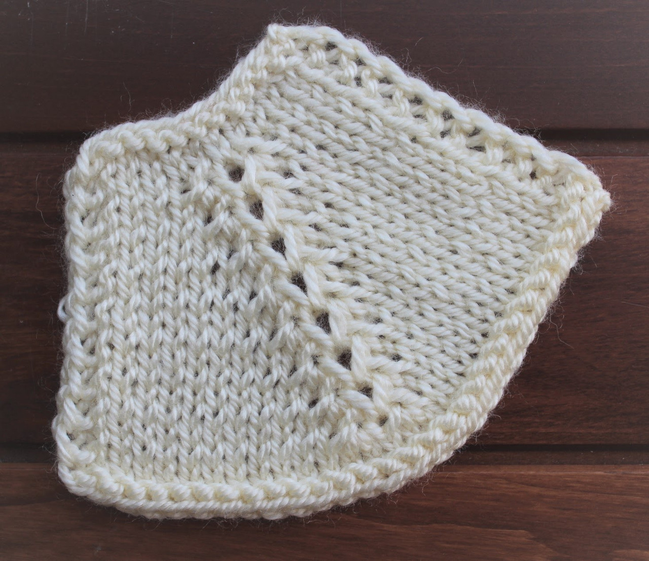 У цьому візерунку регланная лінія складається з 4-х петель. По центру ставимо маркер. В'яжемо по малюнку, не доходячи до маркера 2 петлі. Пров'язуємо ці дві петлі разом з нахилом вправо. Не знімаючи зі спиці, робимо накид від себе на праву спицю, і ще раз пров'язуємо ці дві петлі разом. Після маркера, аналогічно, в'яжемо 2 петлі разом з нахилом вліво, не знімаючи зі спиці, робимо накид від себе, і пров'язуємо ці дві петлі ще раз. 2-й ряд в'яжемо лицьовими в круговому в'язанні і виворітними поворотними рядами. Візерунок становить 2 ряди, які повторюються.