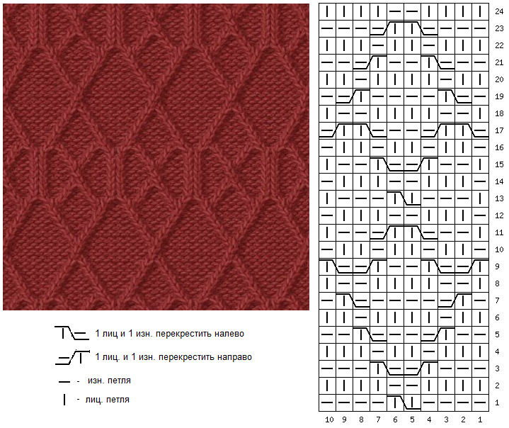 Раппорт візерунка 10 петель. 24 ряду. У цьому візерунку перехрещування лицьової і виворітної петлі з нахилом вліво і вправо.
