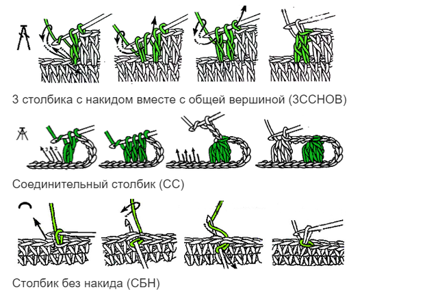 5-й р - 3 ПП, 1 СЗН в цю ж петлю, 1 ПП, в 3-ю ПП нижнього ряду 2 СЗНЗО, в наступний СЗН нижнього ряду 2 СЗНЗО, 2 ПП, 3 СЗН разом із загальною вершиною, 2 ПП, пропустити 1 ПП, 32 СЗН, 2 ПП, 3 СЗНЗВ, 2 ПП, 2 СЗНЗО, в перший СЗН нижнього ряду, 2 СЗНЗО, в другий СЗН, 1 ПП, 2 СЗНЗО в 3-ю ПП, 1 ПП, 2 СЗНЗО, перший СЗН нижнього ряду, 2 СЗНЗО, у другий СЗН, 2 ПП, 3 СЗНЗВ, 2 ПП, 20 СЗН, 2 ПП, 3 СЗНЗВ, 2 ПП, 2 СЗНЗО, в перший СЗН нижнього ряду, 2 СЗНЗО, у другий СЗН, 1 ПП, 2 СЗНЗО в 3-ю ПП, 1 ПП, 2 СЗНЗО, в перший СЗН нижнього ряду, 2 СЗНЗО, в другий СЗН, 2 ПП, 3 СЗНЗВ, 2 ПП, пропустити 1 ПП, 32 СЗН, 2 ПП, 3 СЗНЗВ, 2 ПП, 2 СЗНЗО, в перший СЗН нижнього ряду, 2 СЗНЗО, в другий СЗН, 1 ПП, 2 СЗНЗО в 3-ю ПП, 1 ПП, 2 СЗНЗО, в перший СЗН нижнього ряду, 2 СЗНЗО, в другий СЗН , 2 ПП, 3 СЗНЗВ, 2 ПП, пропустити 1 ПП, 20 СЗН, 2 ПП, 3 СЗНЗВ, 2 ПП, 2 СЗНЗО, у перший СЗН нижнього ряду, 2 СЗНЗО, у другий СЗН, 1 ПП, з'єднати ряд у 3 - ю ПП.