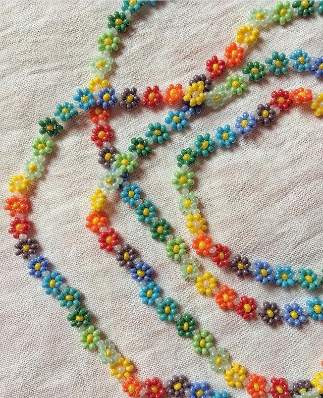Плетіння засноване на використанні однієї нитки, при додаванні намистин окремі квіточки перетворюються на браслет.