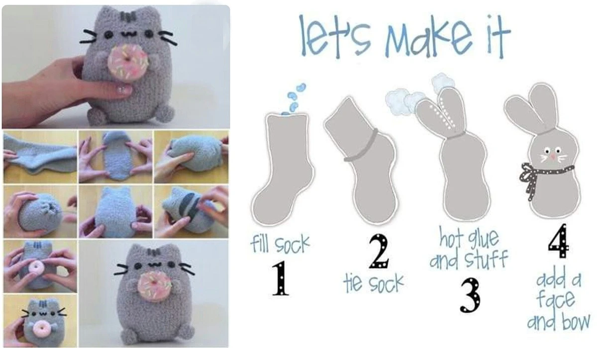 Шкарпетки – універсальний матеріал для творчості. Візьміть один, набийте його холлофайбером, можна вставити механізм "неваляшка" (така іграшка завжди вставатиме у вертикальне положення, як би кошеня її не штовхало — весело та безпечно)