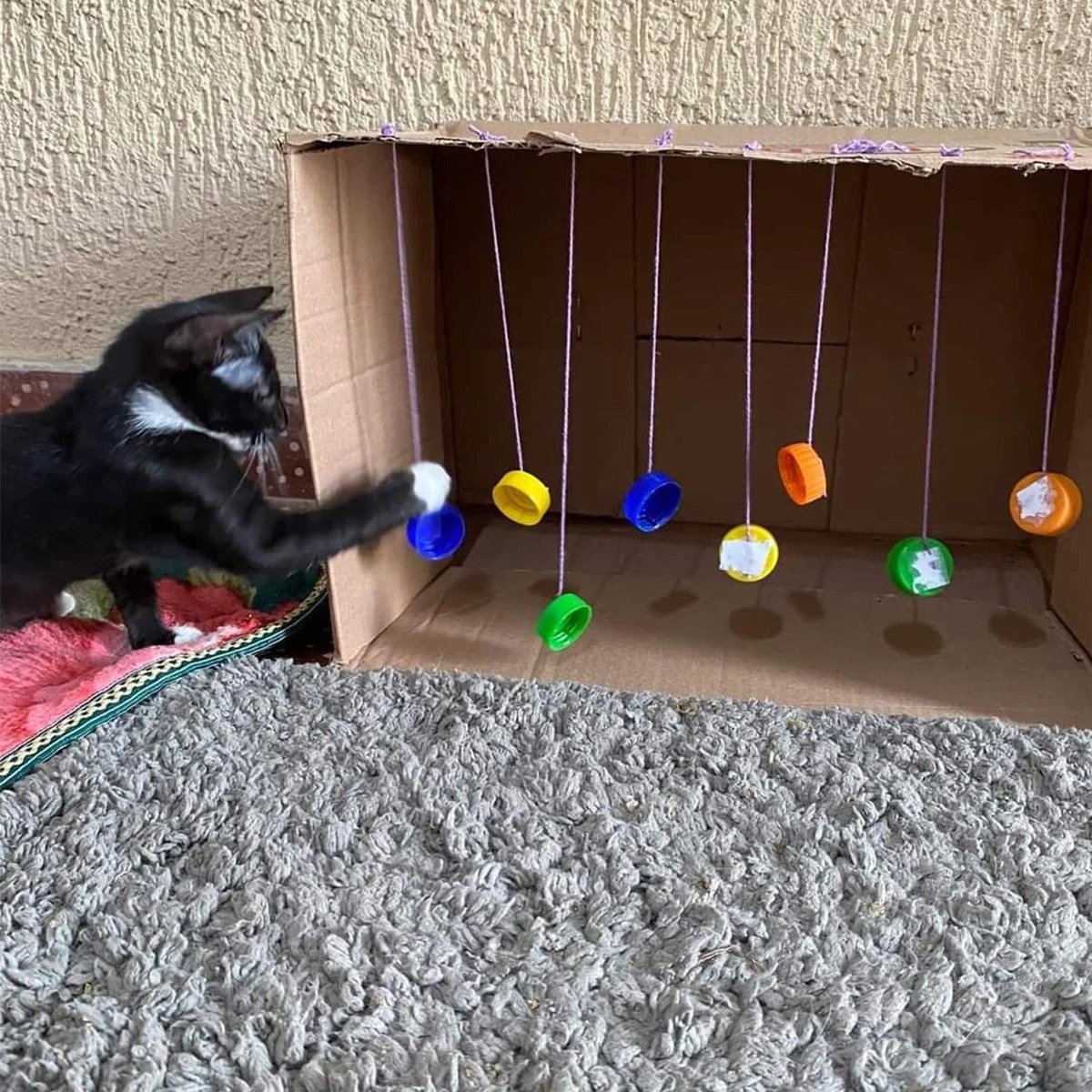 Кошеня і коробка - кохання з першого погляду. Навіть якщо коробка щойно з-під посилки, дайте їй друге життя. Зробіть у стінках отвори різного розміру, вставте туди мотузочки, стрічки або приклейте всередині брязкальця. Можна з'єднати кілька коробок скотчем, щоб вийшов цілий лабіринт для кота-дослідника.