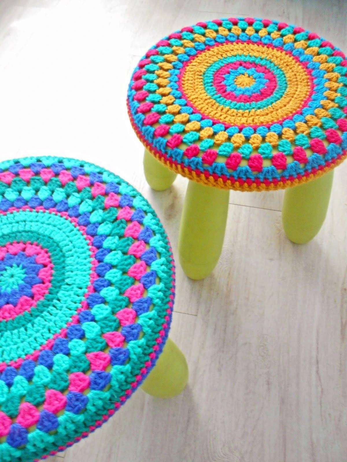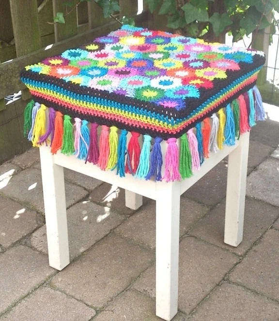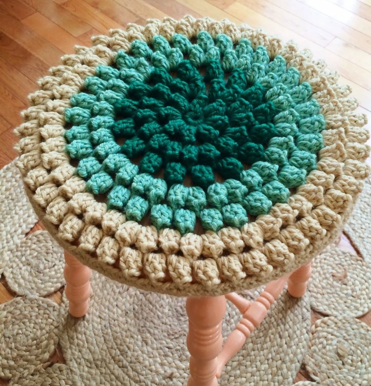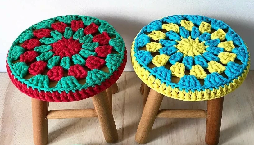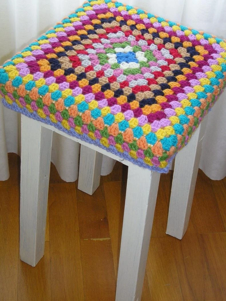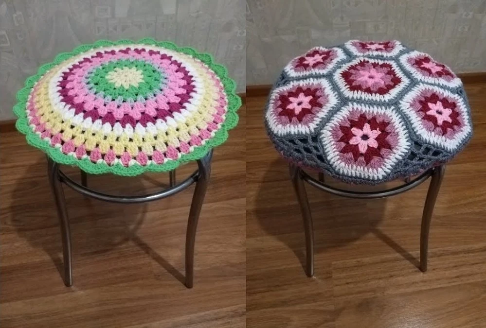 Для табурета чудово підходять як круглі, так і квадратні моделі. В’язані накидки роблять табурет комфортнішим і візуально теплішим.