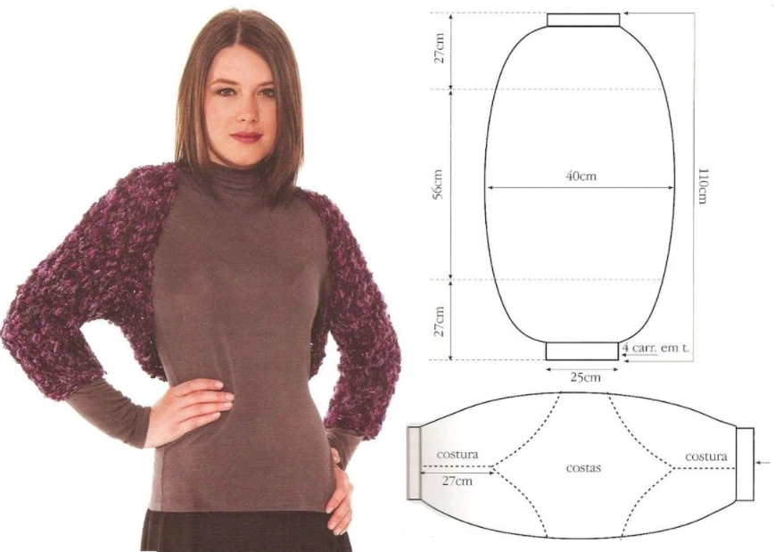 Викрійка, по якій в’яжеться, дуже проста. Починаємо від одного рукав і закінчуємо іншим. Рукава можна почати і закінчити резинкою. А основне полотно може буть яким візерунком чи просто лицьовою гладдю.