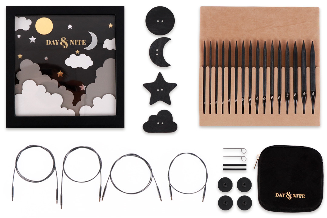 Набір знімних спиць Day and Night, день і ніч від KnitPro. Завдяки з'єднанню контрастних чорних і світлих натуральних відтінків на поверхні однієї спиці, ці елегантні знімні спиці миттєво створюють правильний фон для пряжі всіх кольорів. В'яжете з гарної темної пряжі? Не проблема. Просто поверніть спицю світлою натуральною стороною й темна пряжа буде добре видно на світлому тлі.
