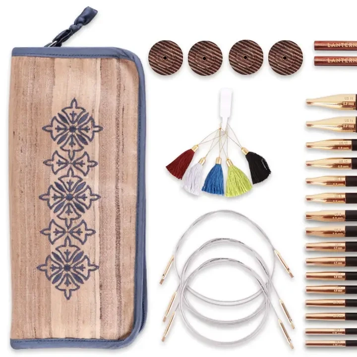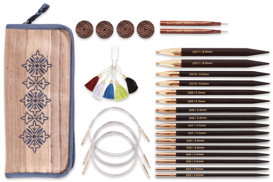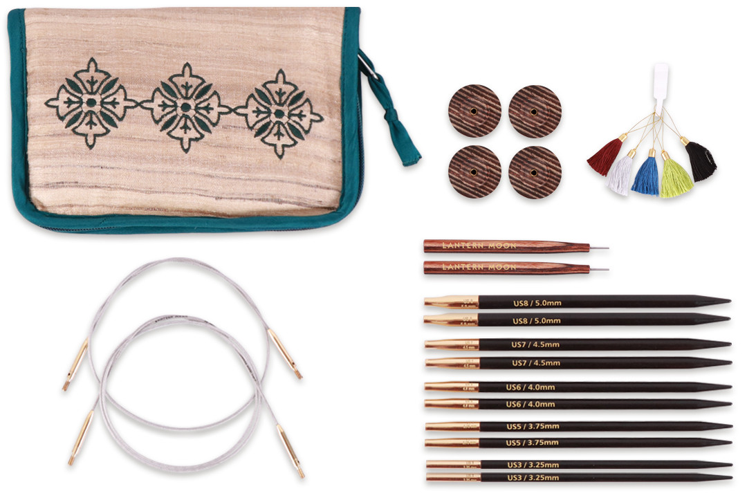 Популярні спиці Lantern Moon виготовлені з цінного міцного ебенового дерева/обробленого рідким шовком/що забезпечує плавне ковзання для всіх типів пряжі. Футляри наборів виготовлені з шовку Хаді — історично важливого індійського матеріалу. Зовні вишиті прекрасними квітковими мотивами. Кожен набір ніжно упакований у лаконічний сірий сітчастий футляр із логотипом і стрічкою під тон.