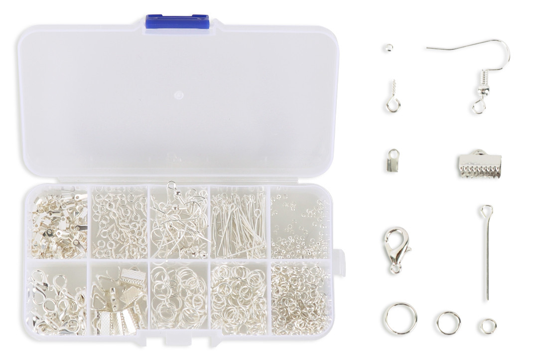 Набір для виготовлення біжутерії на 10 комірок. У такому наборі ви знайдете все необхідне, щоб створити прикрасу власними руками. Це можуть бути сережки, підвіски, намиста, браслети та все, на що вистачить вашої фантазії. Усі елементи зберігаються в пластиковому органайзері з окремими ланками для 10 різновидів фурнітури. У наборі є швензи, кільця, штифти, карабіни та кримпи.